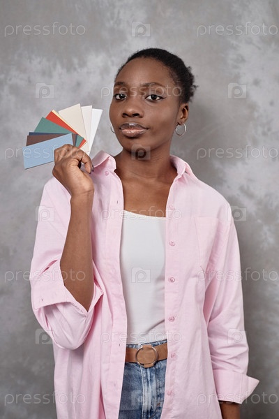 Черная женщина показывает бумажные образцы различных цветов