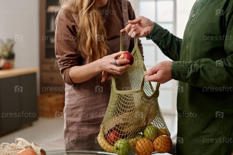 Женщина кладет яблоко в сумку