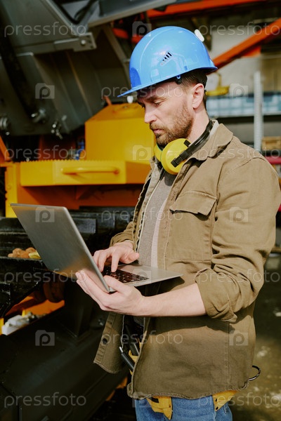 Фабричный рабочий использует ноутбук