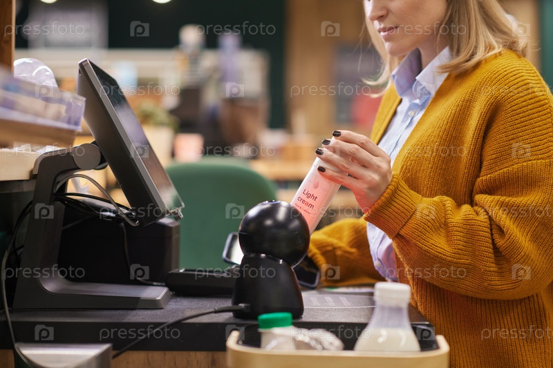 Закрыть женщину, сканирующую молочные продукты на самостоятельной кассе в супермаркете