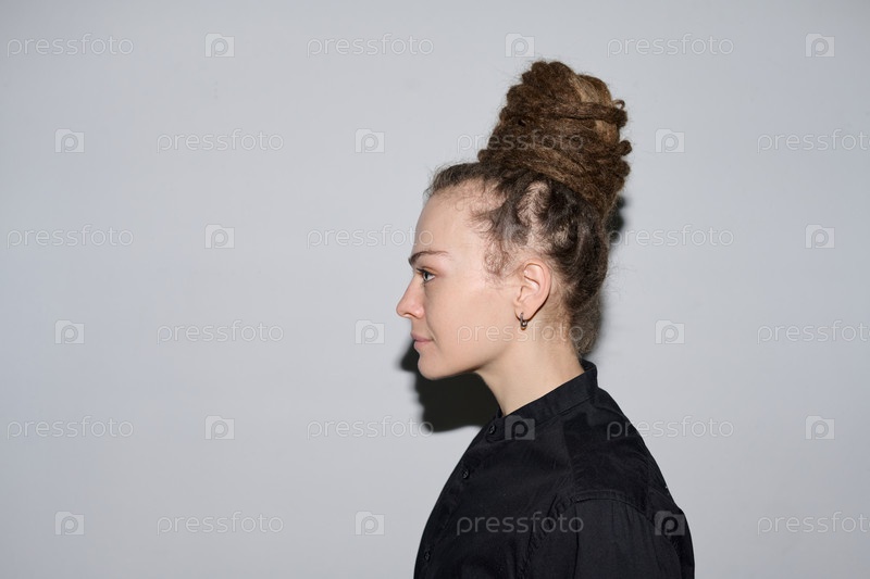 Женщина с дредлоками в булочке, стоящая на белом цвете со светом