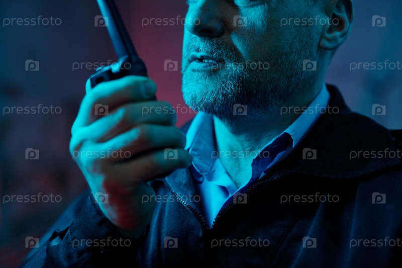 Зрелый охранник, говорящий по радиозвонку