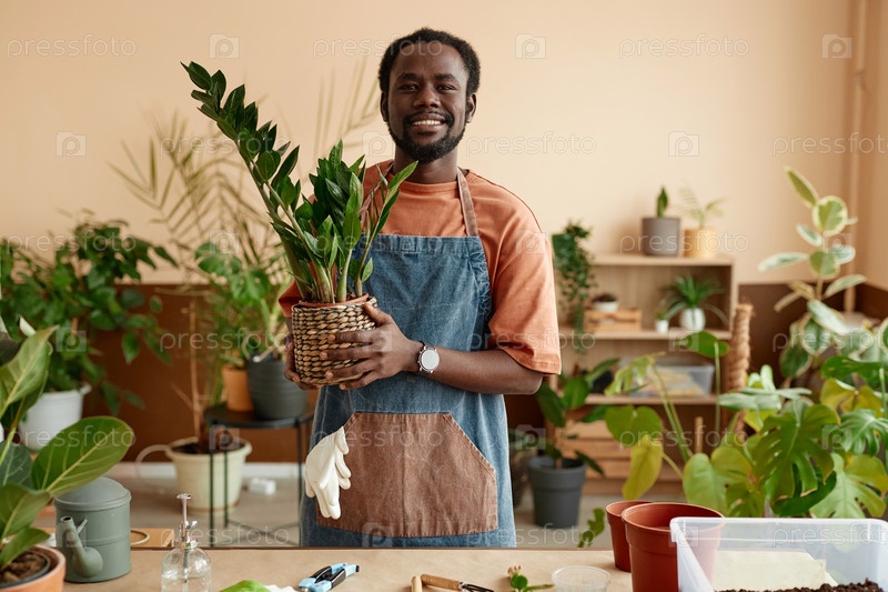 Улыбающийся чернокожий мужчина держит горшочное растение