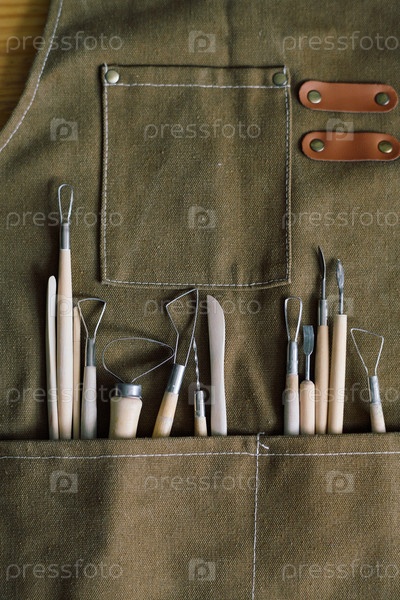 Глинистые резьбовые инструменты в кармане фартука