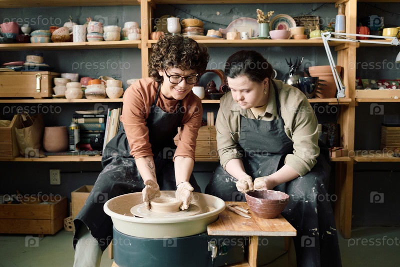 Ремесленник показывает женщине с инвалидностью, как использовать колесо Поттера
