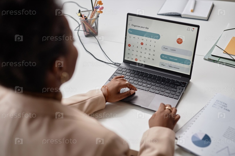 Экран ноутбука со страницей календаря и печатанием черной женщины