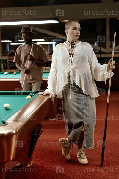 лысая молодая женщина стоит у бильярдного стола