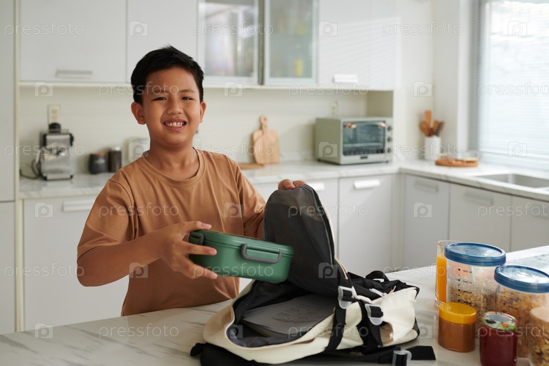 Школьник кладет коробку с обедом в школьную сумку