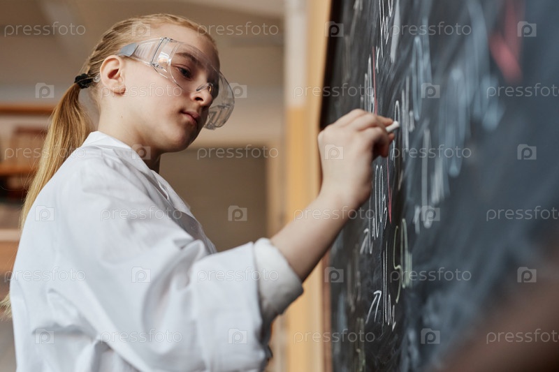 Девочка пишет на доске в классе химии