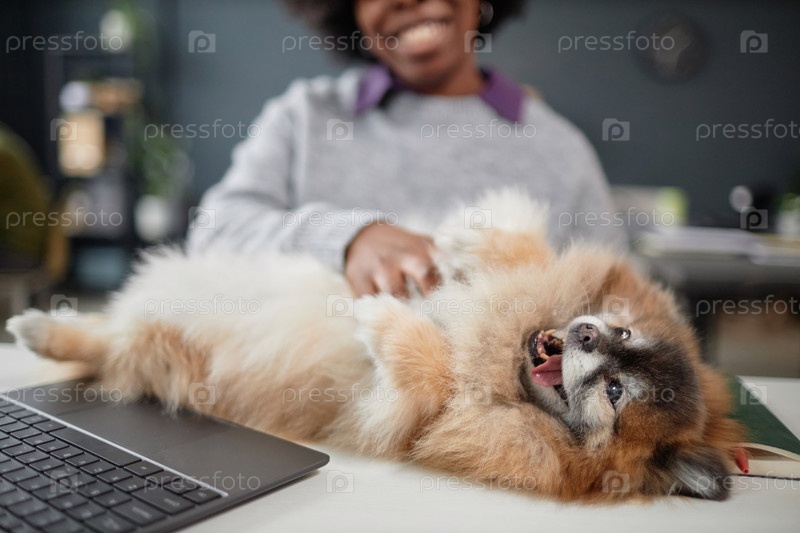 Собака на столе в дружественном к домашним животным офисе наслаждается брюшной массажом