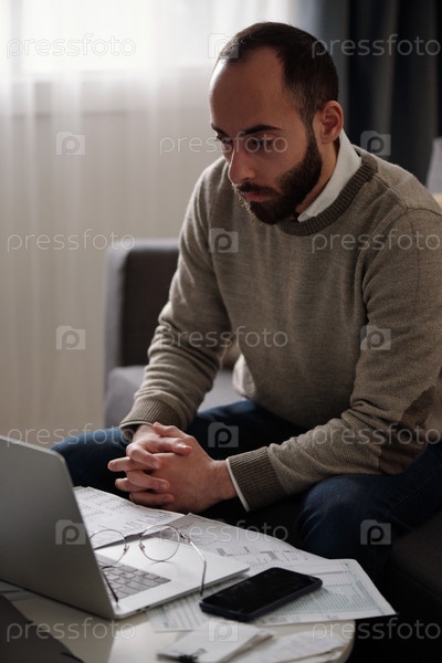 Серьезный мужчина смотрит на экран ноутбука