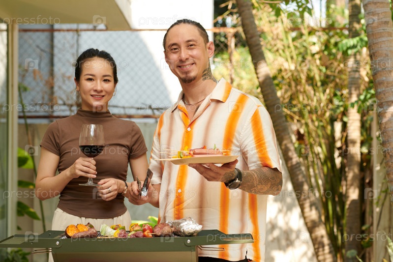 Пара ест жареное мясо и овощи