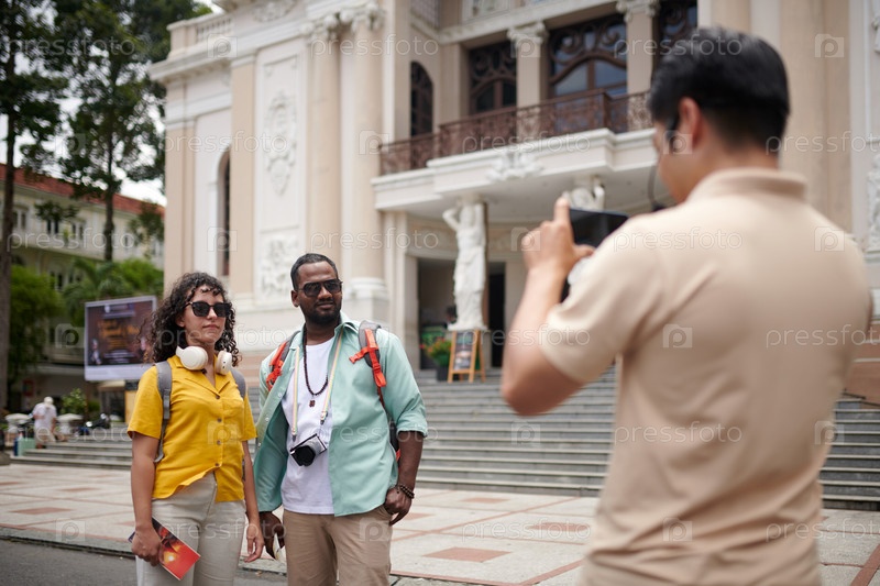 Пара позирует для гида со смартфоном