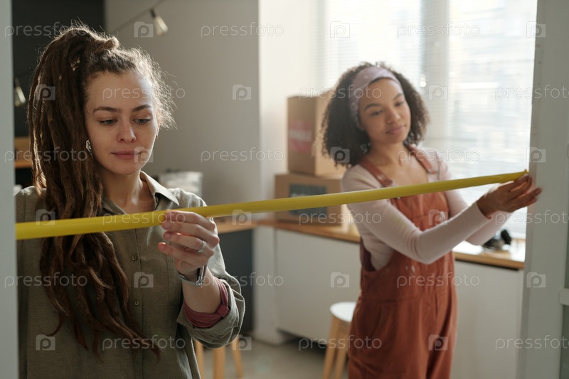 Работницы-женщины измеряют ширину дверного проема