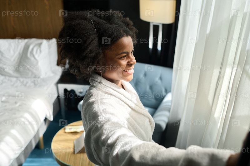 Черная молодая женщина открывает окно