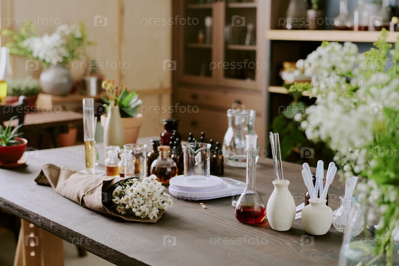 Деревянный стол с парфюмерным оборудованием