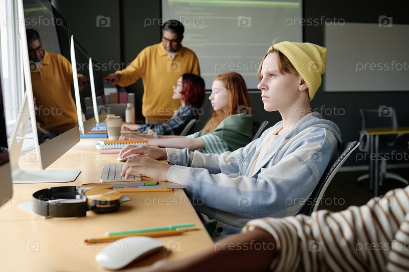 Серьезный подросток во время урока программирования в школе