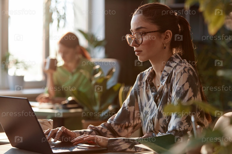 Уверенная в себе деловая женщина, использующая компьютер с солнечным светом