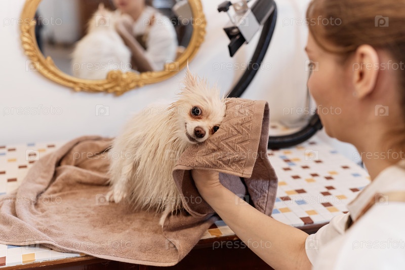 Щенок, завернутый в полотенце в студии ухода за ребенком
