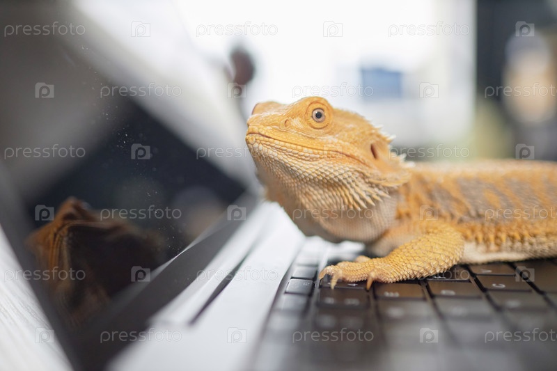 Close Up Pet Игуана сидит на компьютерной клавиатуре