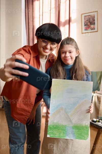 Учительница искусства делает селфи со студентом в студии