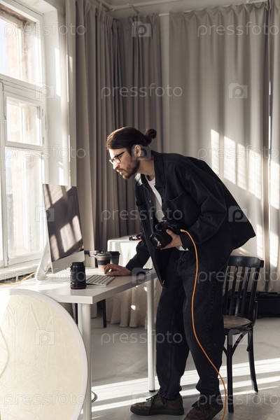 Человек, держащий камеру и использующий компьютер