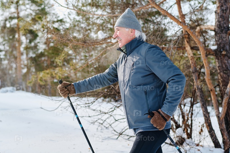 Зрелый мужчина катается на лыжах в активном парке