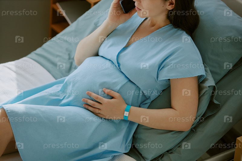 Молодая беременная женщина лежит на кровати и болтает