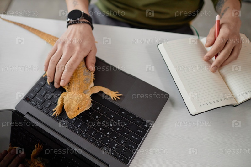 Top View of Man Petting Iguana на клавиатуре