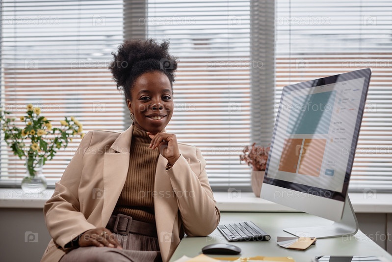 Портрет модной чернокожей деловой женщины, глядящей на камеру