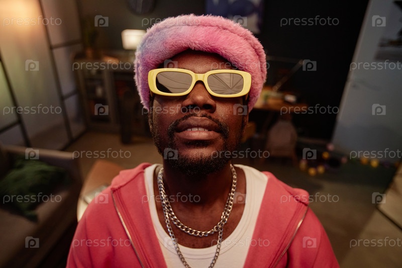 Чернокожий мужчина в розовом наряде со солнцезащитными очками