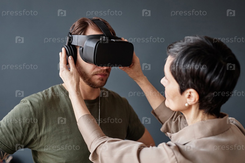 Психолог устанавливает VR-гарнитуру на солдата