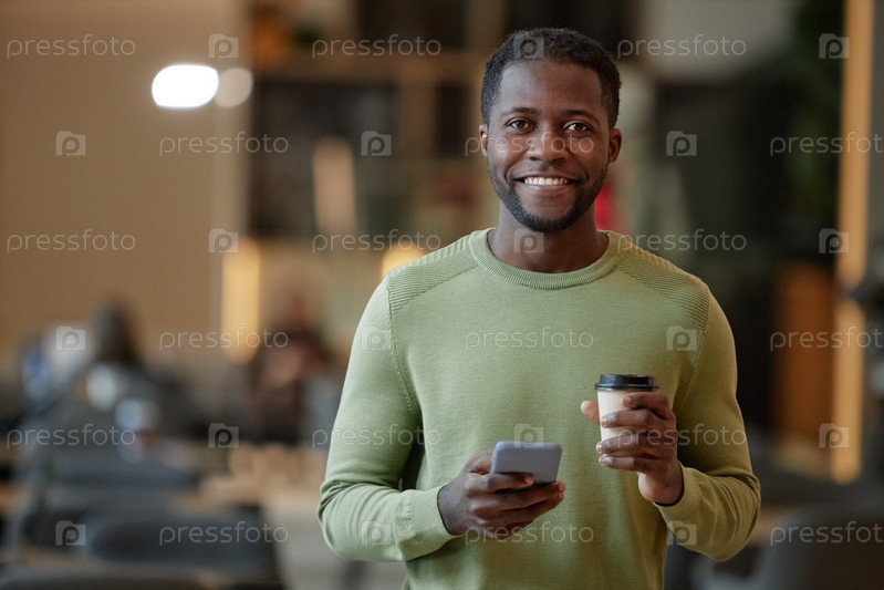 Улыбающийся чернокожий мужчина держит смартфон