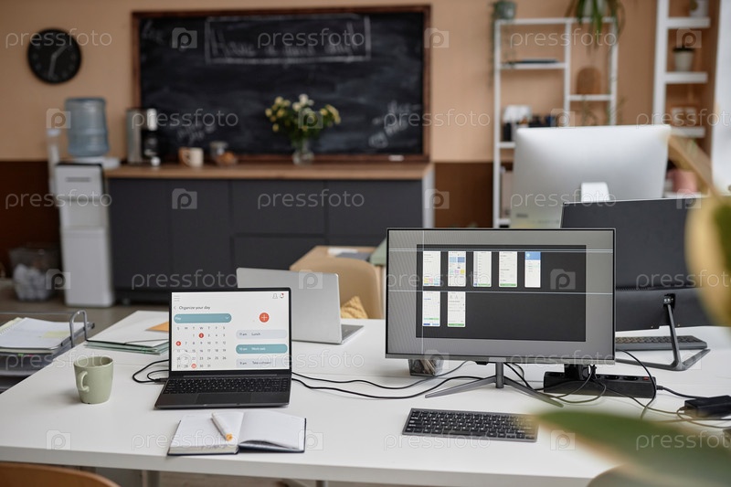 Ноутбук и компьютер на рабочем месте Стол в офисе с доской