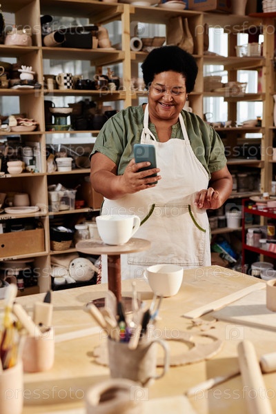 Старшая женщина фотографирует керамику в посудомоечном магазине