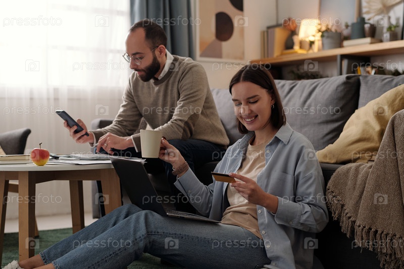 Счастливая женщина смотрит на кредитную карту