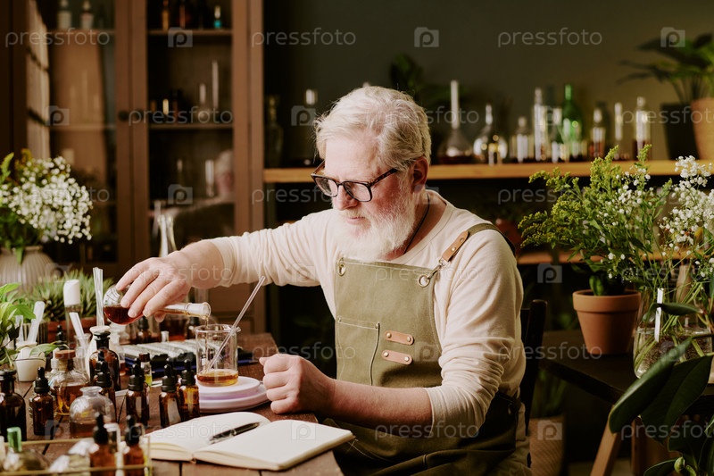 Парфюмер сидит за столом и создает аромат Мужчина