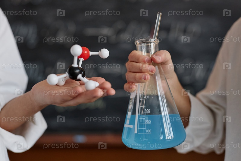 Непризнанные дети, держащие лабораторную бутылку и модель химической структуры