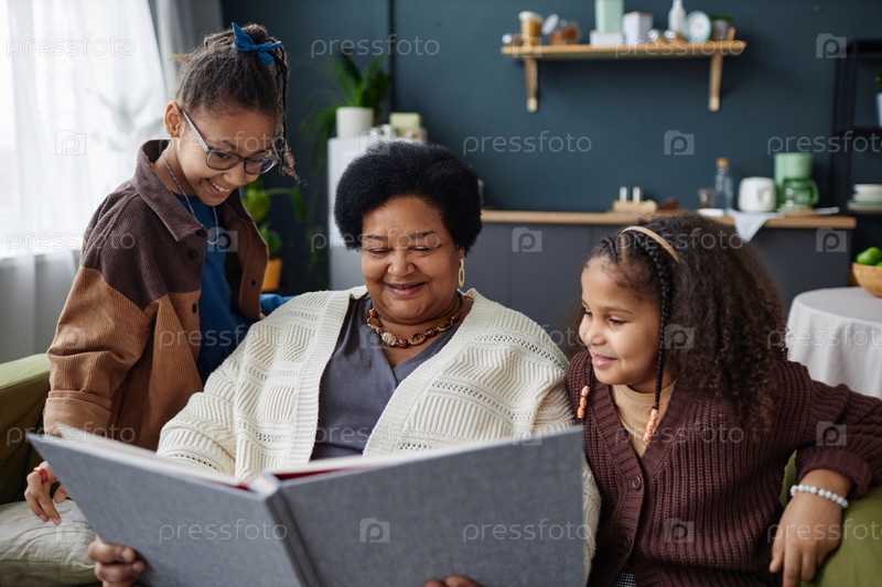 Старшая чернокожая женщина с двумя детьми смотрит на семейные фотографии