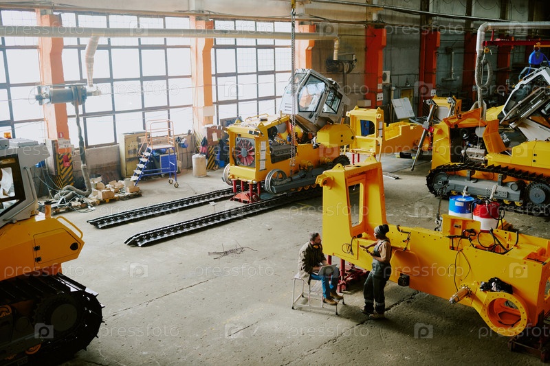 Мужчина и женщина работают на фабрике бульдозеров