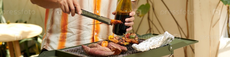 Гриллинг креветки на гриле в заднем дворе
