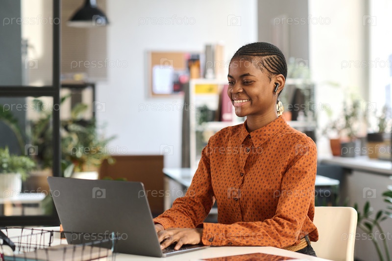 Веселая чернокожая женщина, использующая компьютер за рабочим столом