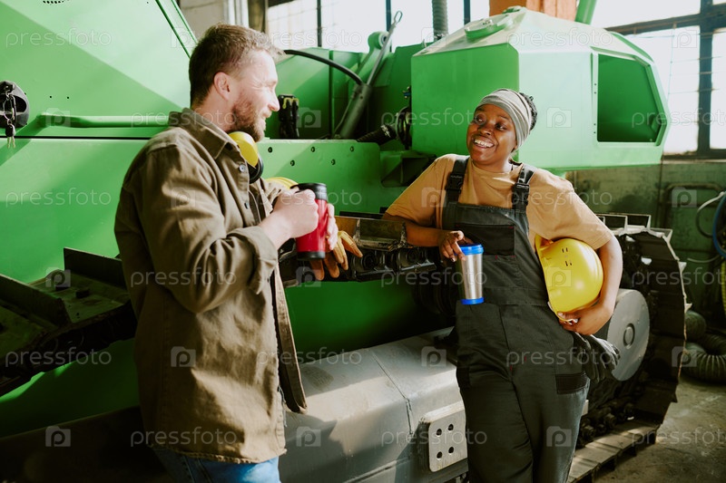 Веселые коллеги работают в кафе на заводе