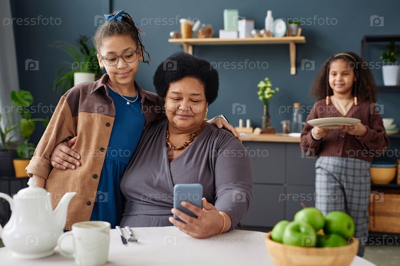 Черная бабушка обнимает девушку, которая смотрит на телефон в кухне