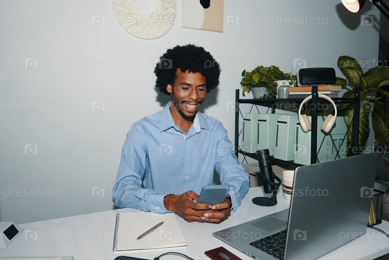 Черный бизнесмен, отправляющий сообщения друзьям или коллегам