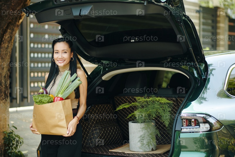 Улыбающаяся женщина с сумкой продуктов
