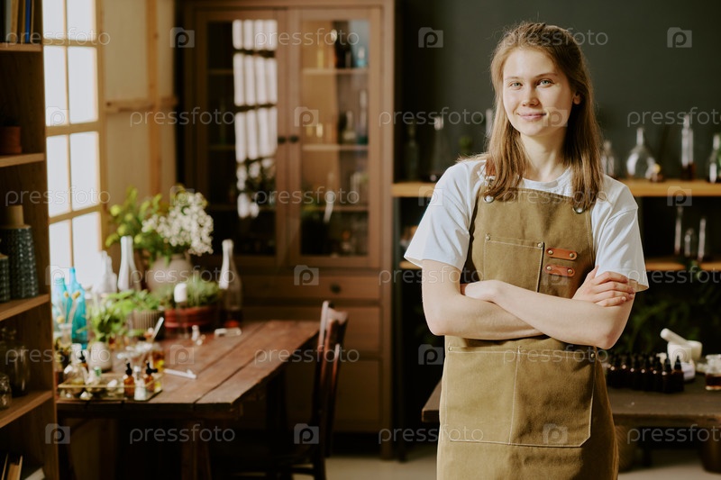 Молодая женщина-парфюмерка, стоящая в лаборатории парфюмерии