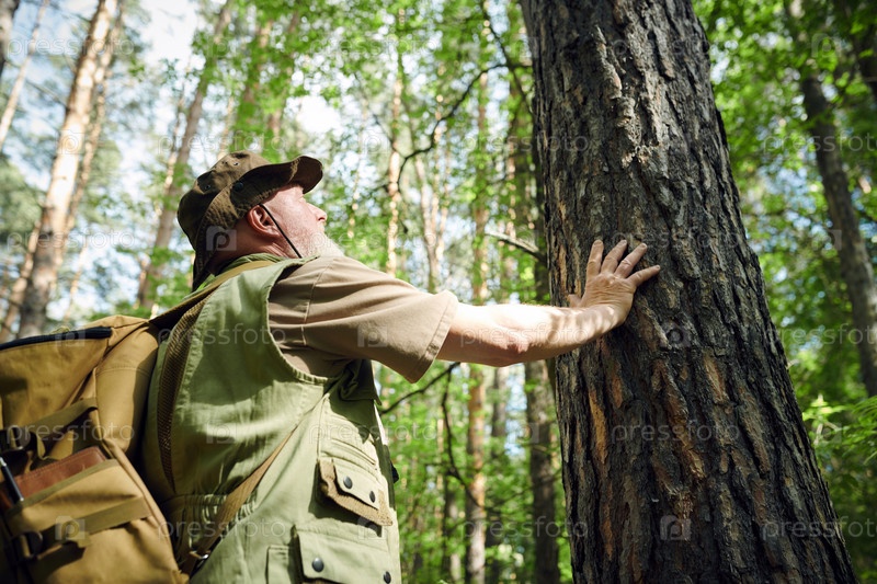 Человек, касающийся коры дерева в лесу