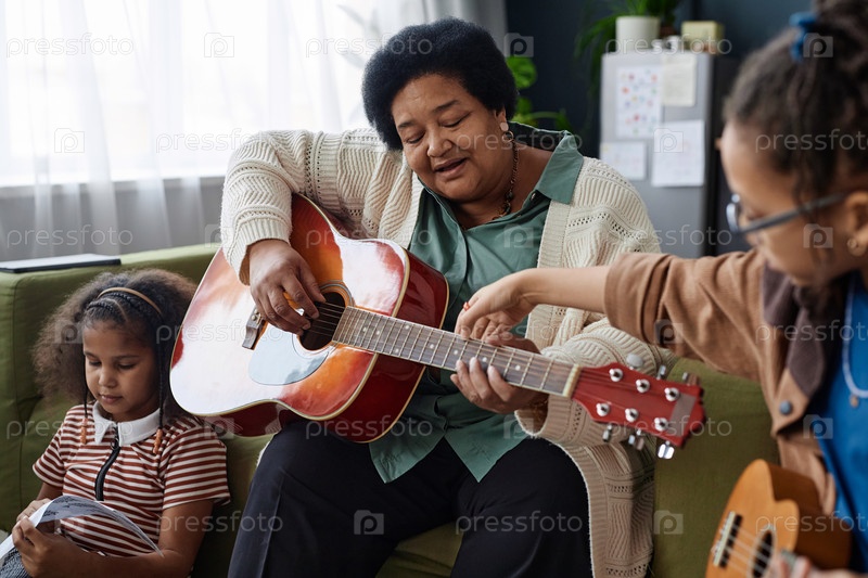 Чёрная старшая женщина играет на гитаре с двумя девушками