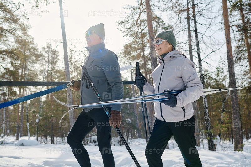 Старшая пара держит лыжи и полюсы, гуляя вдоль парка